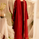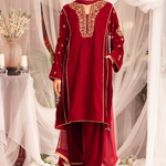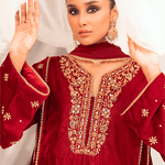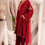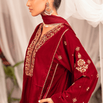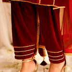 "Zenia" is a maroon velvet 4 kali kurta embellished with detailed gold zardozi work featuring pearls, dabka, sequins, crystals and goat work. It is paired with velvet shalwar allured with lace detailings. The look is finished with a matching chiffon dupatta with handmade samosa tassels and lace trimmings.