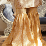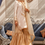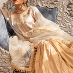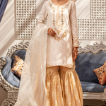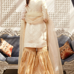'Zuri' is an Ivory luxurious jacquard shirt detailed with gold handwork mirror embroidery and finished with lace details. It is paired with traditional brocade gharara, detailed with gota lace on the hem. This look is completed with a matching organza dupatta adorned with a lace border and sequins spread over it.