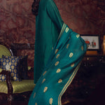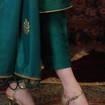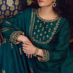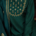 'Amaani' is enriched with high quality silk. It is a straight mid-length emerald green shirt with round neckline and full sleeves. Neckline and sleeves are intricately adorned with kora, dabka, zaari ,aari and regal stones. It is paired with our signature gold screen printed pure silk dupatta with loops finishing.