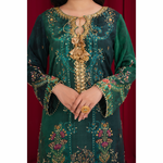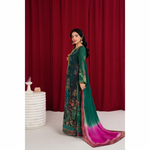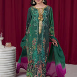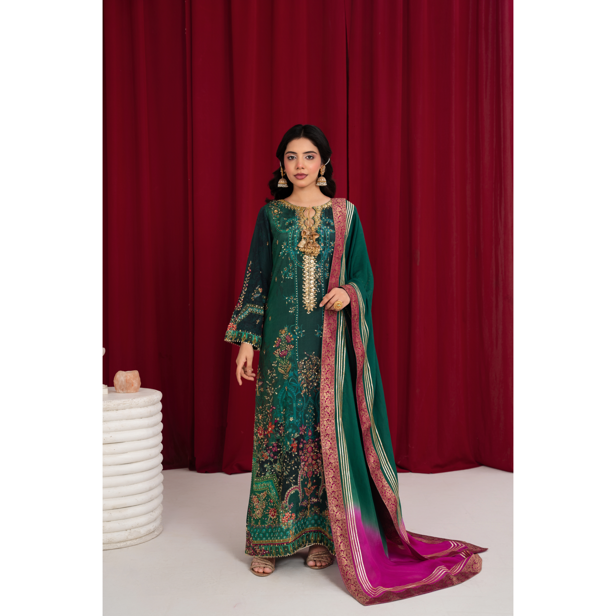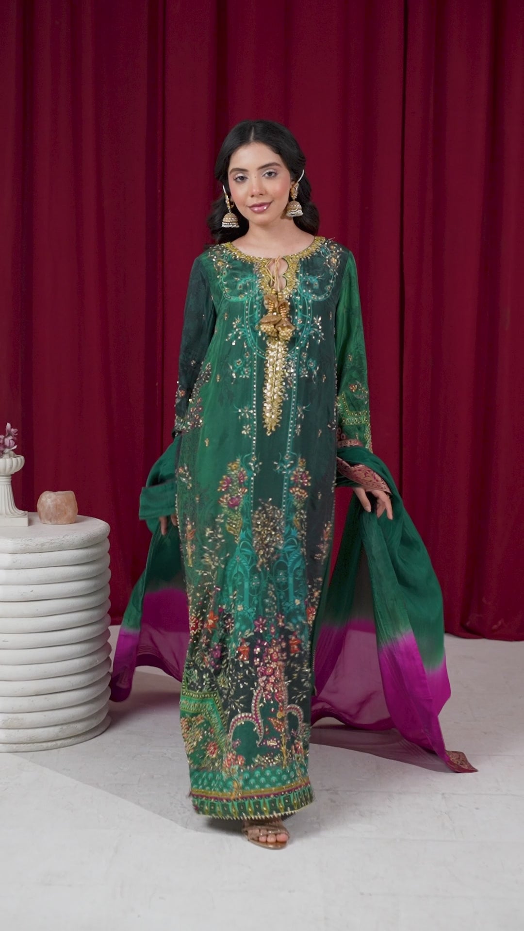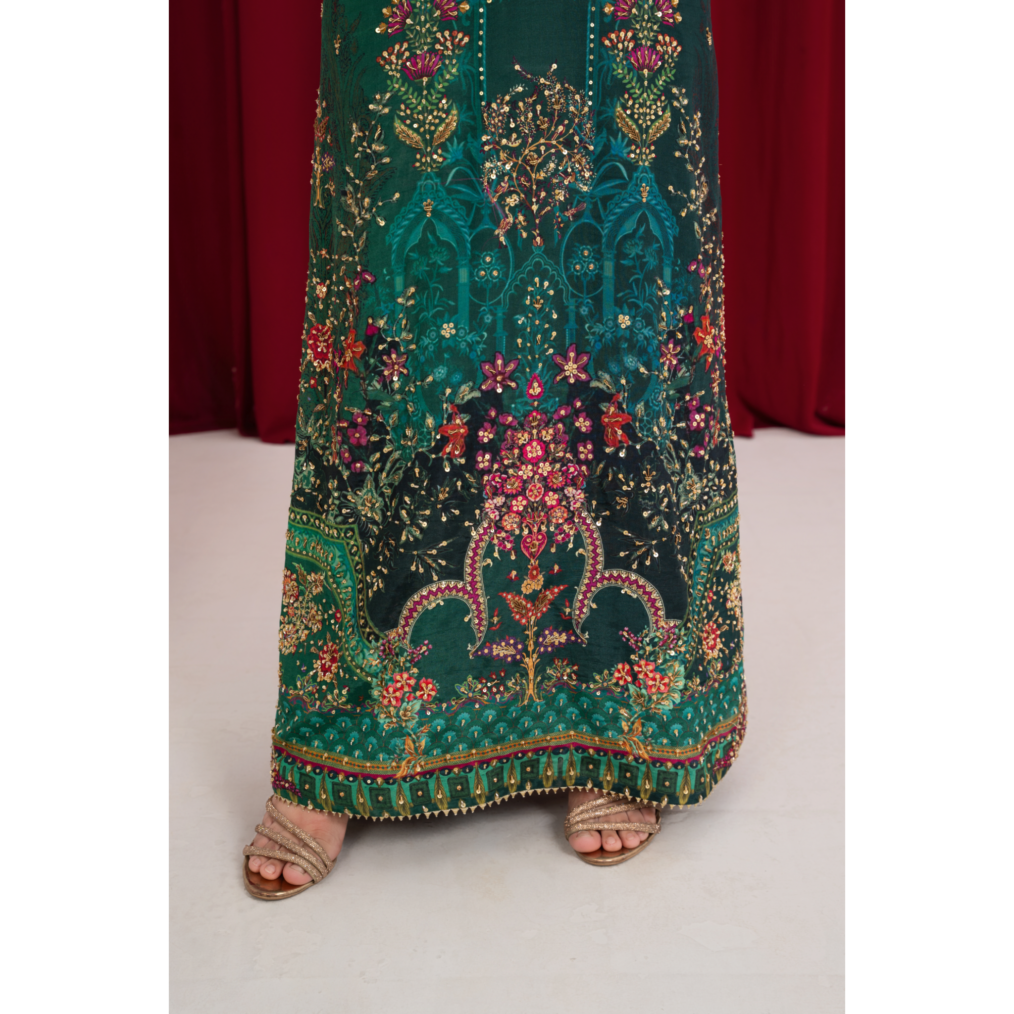 A radiant emerald green kaftan paired with a striking plum‑colored short overlay. Crafted from luxurious *pure silk fabric*, the piece bursts with the same digital garden canvas print, accented by delicate hand‑stitched Jora Dabka embroidery that catches the light. A sheer pure organza under‑layer adds an airy, glamorous feel, while subtle tick finishings bring the look full circle. Completing the ensemble is an elegant *organza dupatta* that enhances the ethereal vibe.