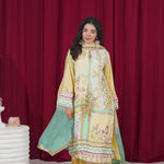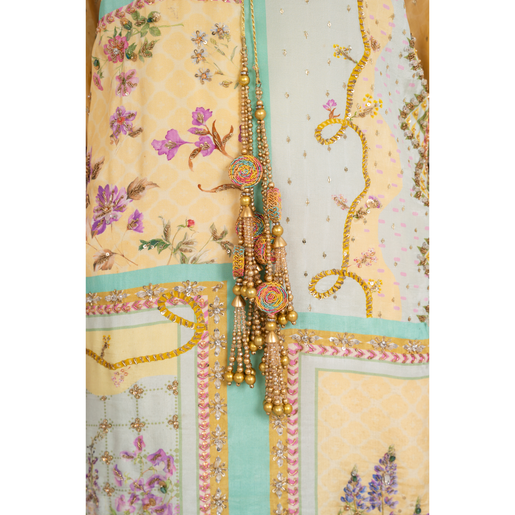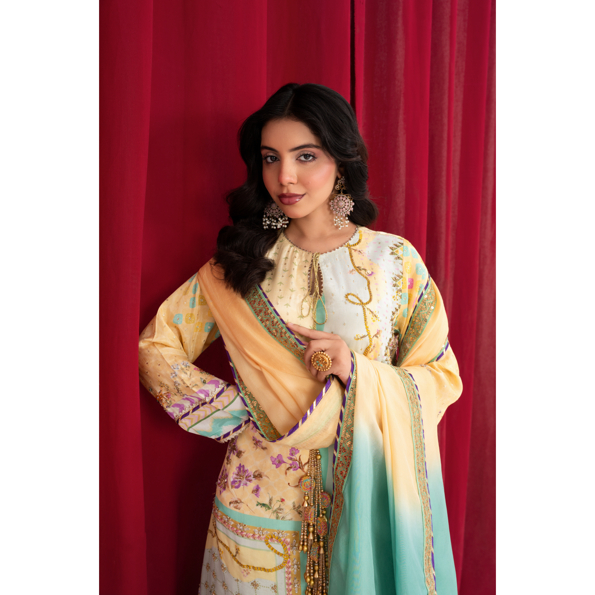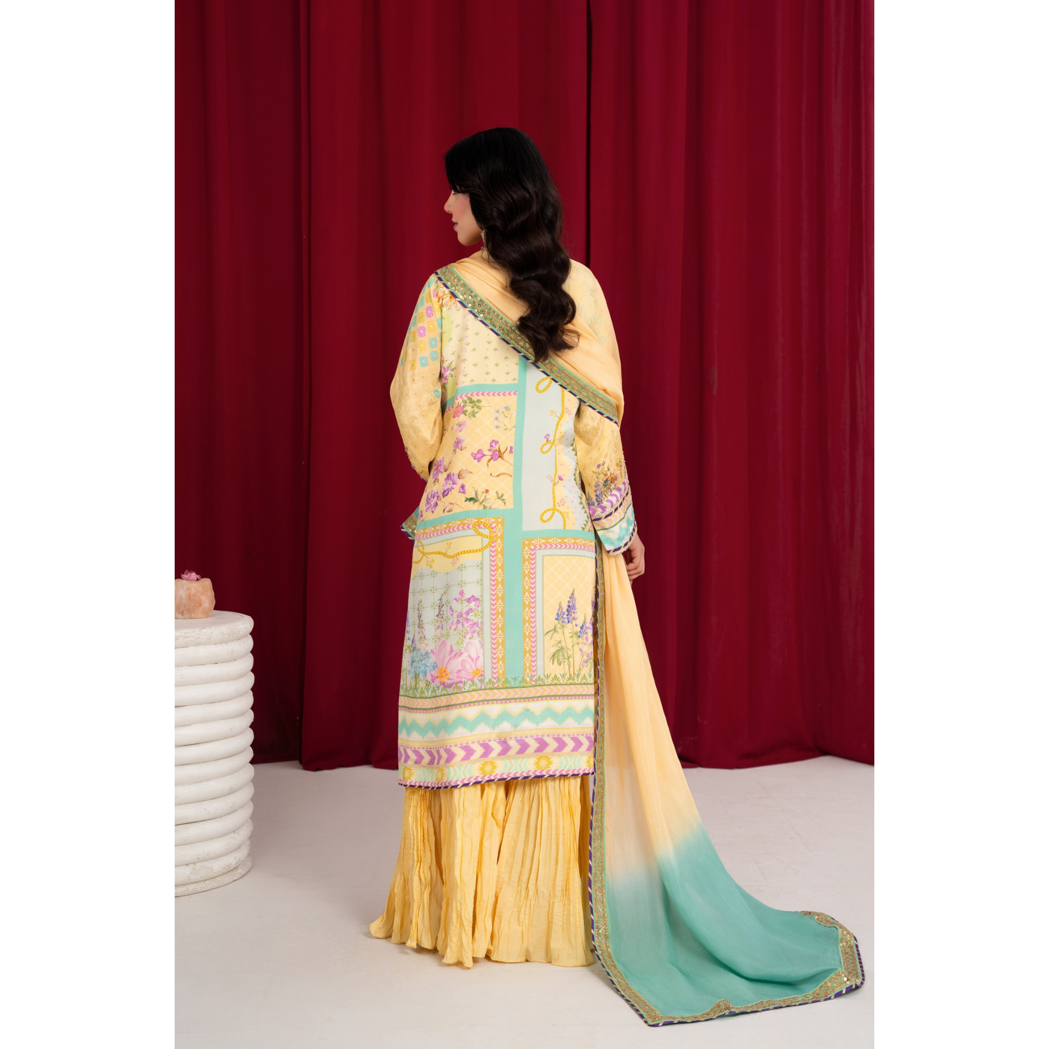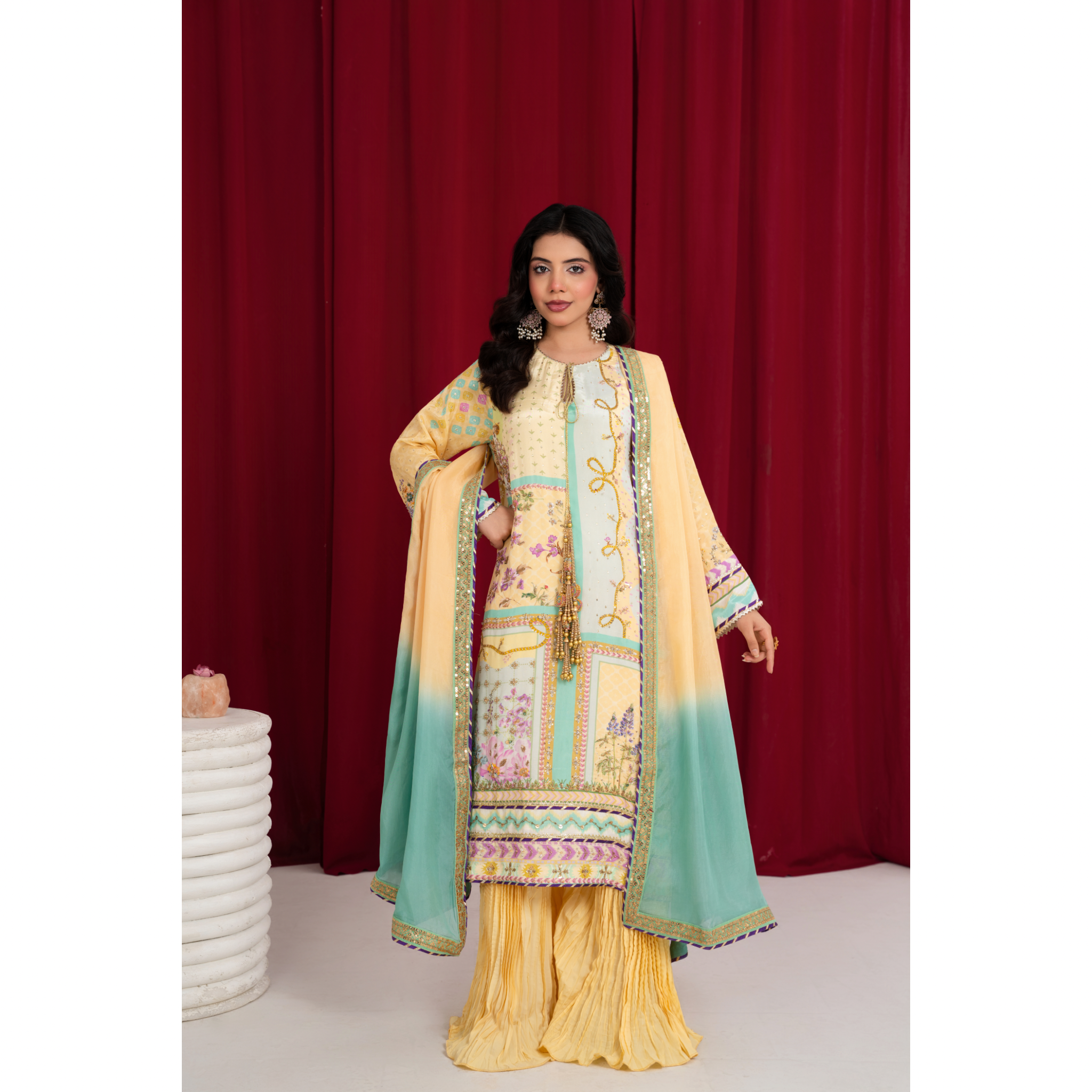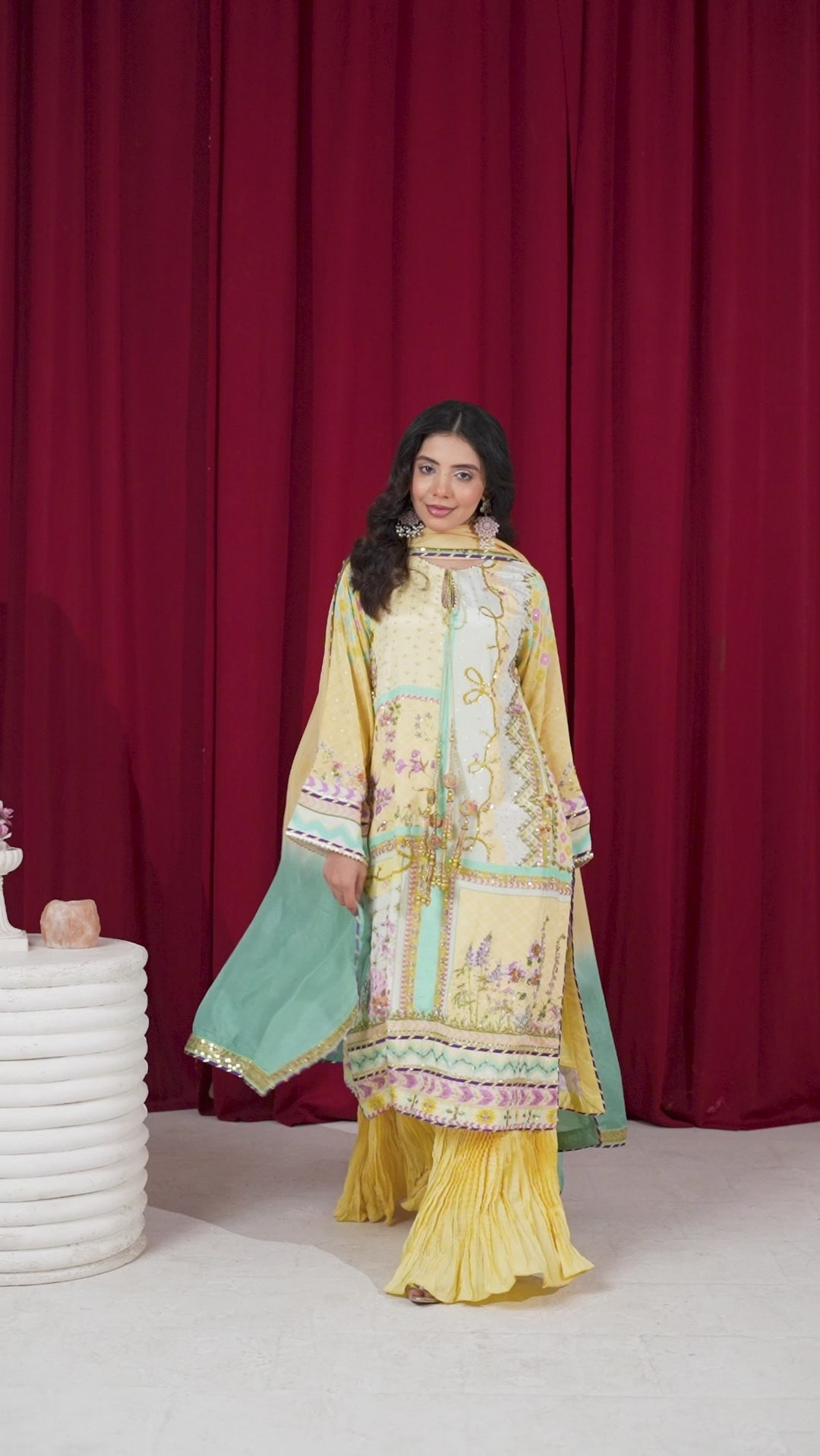🌸💛 Lemon Pop Splash — a luminous lemon‑yellow dress with a chic long‑short silhouette, paired with crushed Dhaka pants. Features a digital garden canvas print, delicate hand‑stitched Jora Dabka embroidery, and a sheer pure organza aduppata that adds an airy glamour. Subtle tick finishings complete the look.