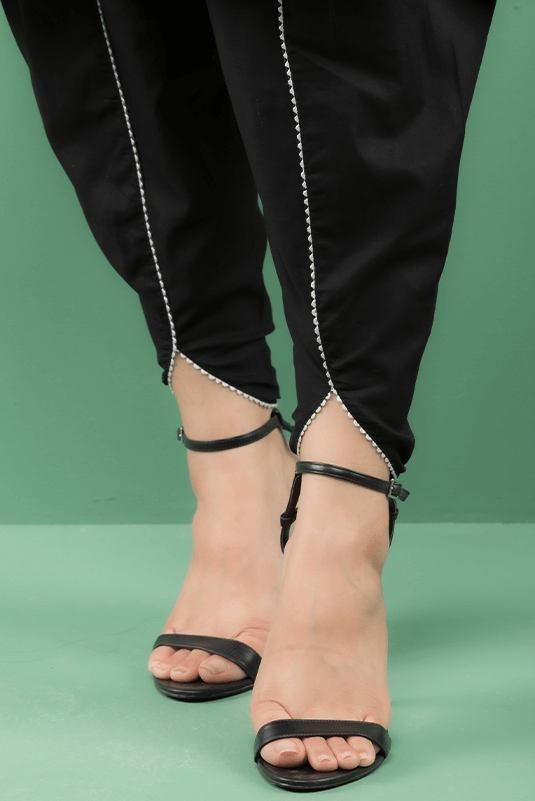 'Black Pearl' is a two piece black solid outfit in cotton with panels and pockets. It is detailed with pearls, pintucks and lace. The sleeves are enhanced with a slit and lace. This outfit is paired with matching tulip shalwar with lace detailing.
