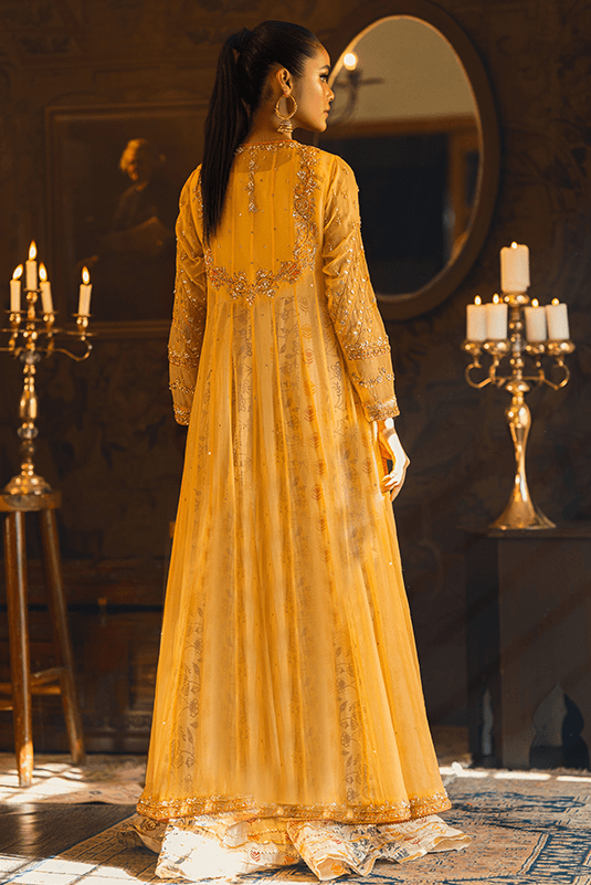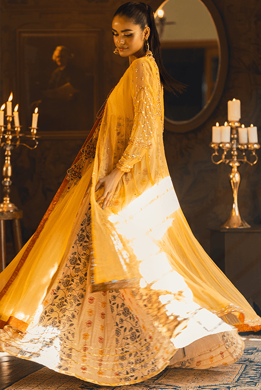 "Mehr-e-Naz" is a long Gold Maysuri peshwas with floral screen-printed panels. The round neckline is hand embroidered with zari and pearls. The outfit is completed with gota laces running at the bottom. This is layered with a mustard yellow chiffon coat with intricate zari and contrasting resham work. The sleeves and the back are heavily hand embellished with zari and intricate pearl and sequins work. The coat is tied at the neckline with long beautifully embroidered contrasting tassels connected with beads.