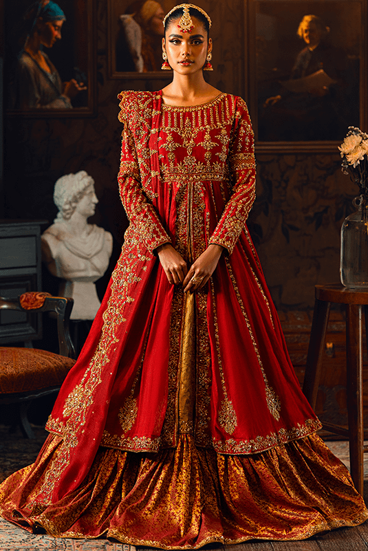 "Mehr-e-Afrin" is a traditional red kalidar open peshwas, embellished heavily with zardoze and resham. This cotton net peshwas is paired with a contrasting banarsi green lehenga with a maroon banarsi embellished border, which adds volume to the flare. The intricate embroidery is detailed with crystals, gota, resham, pearls and sequins. To complete the look, it is complimented by a red cotton net dupatta with elaborately handcrafted zardoze and resham work finishing the pallu.