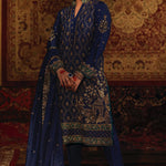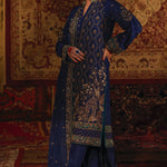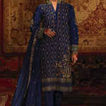 'Angan' is an intricately embroidered dark blue outfit with heavy zardozi work and a touch of contrasting resham. This dress is composed on the theme of mehrab and floral patterns. A band collar is added to the shirt and is paired with pk raw silk straight pants with gota lace finishing. The medium silk dupatta features the elaborate zardozi border and chan. A customized pouch can be added to the outfit upon request.