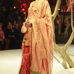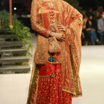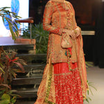 A a strikingly regal ensemble; with heavily embellished shirt, dupatta and gharara. The beautiful short length rust tissue maysuri net kameez is adorned with stunning hand embroidered kora, dabka and zardozi work, with a delicate matka neckline finished with handcrafted heavy tassels and complemented with olive green banarsi finishings all over. This elegant dress has a beautiful bright red gharara of two different types of banarsi with overall embellishments. The eye-catching outfit is completed with a heavy elaborated rust tissue maysuri dupatta, finished with delicate lace finishings.