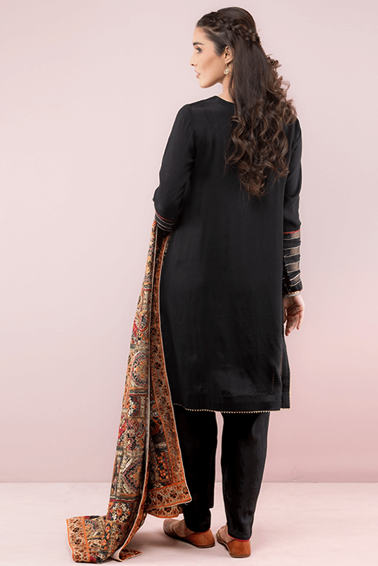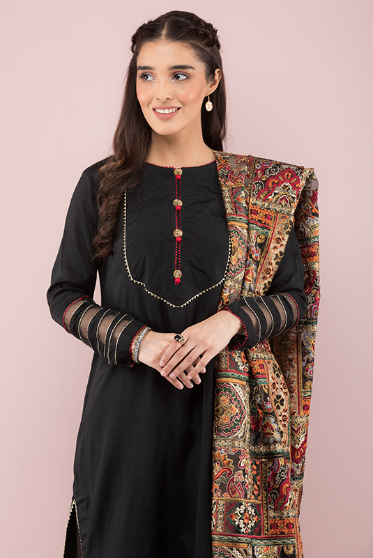 'Ember' is a black co-ords. The shirt has a stylized neckline with gota buttons. The sleeves are detailed with organza and lace. It is paired with a black tulip shalwar with lace edging and a heavily embroidered organza dupatta.