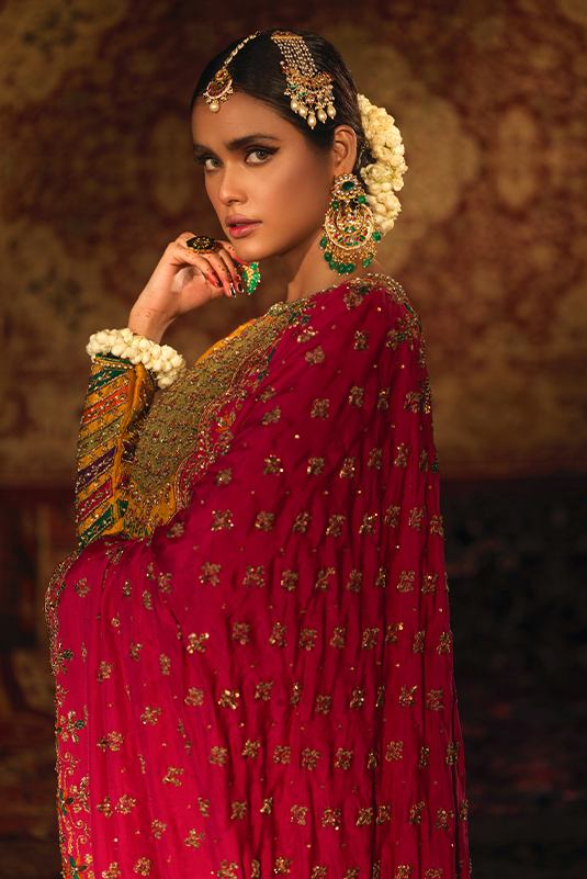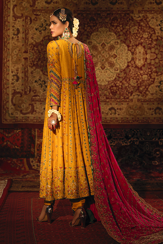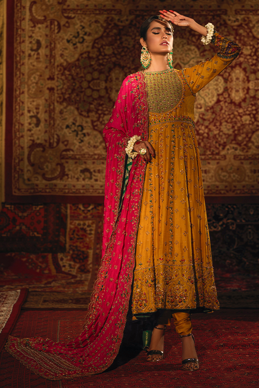 'Kaus-o-qaza' is a whimsy blend of floral and mehrab motifs in a stunning marigold yellow kalidar frock, attached with a beautiful sage green neckline and embroidered with the traditional crafts of kora,dabka and resham. The fabric used is raw silk featured with luscious shades of fuschia pink, deep green, purple, sage green and orange all encapsulated with hand crafted chattapati on sleeves, enhancing the overall look of the kalidar frock and finished with vivid green banarsi. The gorgeous kalidar is perfect for a bride on her Mehndi occasion.