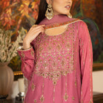 'Balle Balle' Ready to wear three piece dress in shades of pink and burnt orange. Intricate, gold hand embroidered shirt and shalwar, paired with net detailed heavy embroidery dupatta with chan and banarsi off-white paltawa.