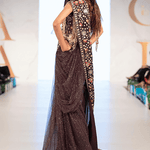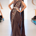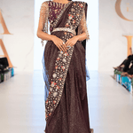 This deep plum shimmer net saree is inspired by midnight. It has a beautiful drape and is paired with a heavily embellished blouse with a story going on at the back. It is finished with intricate heavy gold fringes on the sleeves.
