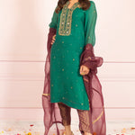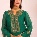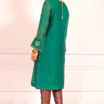 ‘Henna' is an appealing green khaddi net kurti, hand crafted with gold and copper zardozi with sheesha and contrasting resham work. It has intricate embroidery on the neckline and sleeves with a slit. The shirt is finished with plum banarsi finishing.