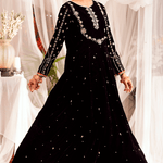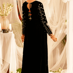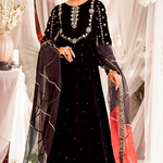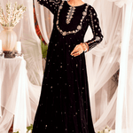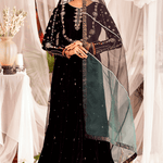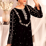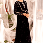 "Mahgul" is a classic black velvet kalidaar embellished with intricate hand embroidery on neckline and sleeves with pearls, dabka, sequins and mirror work . It is paired with churidar.