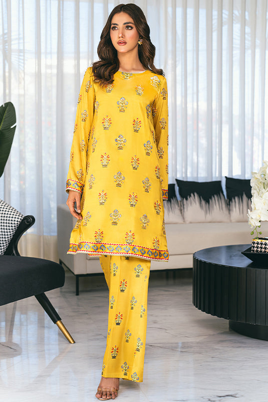 "Naira " is a dhaani color straight short shirt beautified with printed botanical motifs and hand embroidery . Front of the shirt and sleeves embellished with intricate dabka,kora, sequins, pearl work. It is paired with matching flared pants.