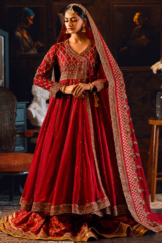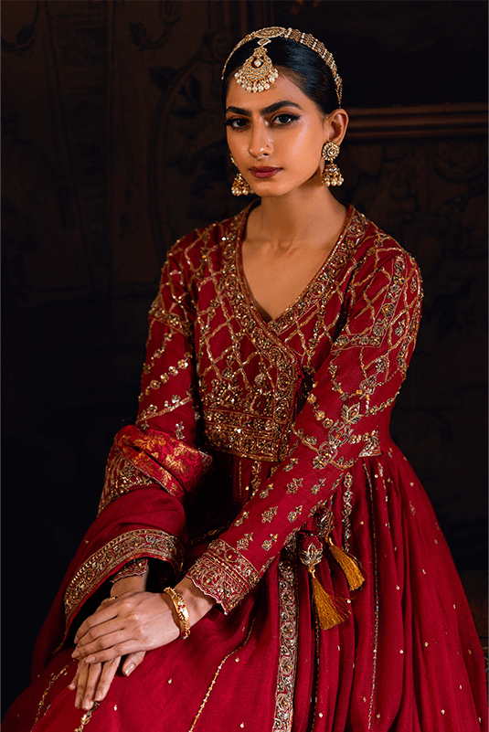 "Nazanin" is a traditional Khaddi net beautiful angrakha style dress which is heavily embellished and hand embroidered with a beautiful composition of kora, dabka, zari, pearls, sequins zardoze and resham. The angrakha is closed with embroidered tassels. The back is intricately embellished and has a cutwork pattern to add to the beauty of the angrakha. This is paired with a khaddi net dupatta with heavily embellished borders. A red banarsi lehenga with sequins and gota laces are added to complete this bridal look.