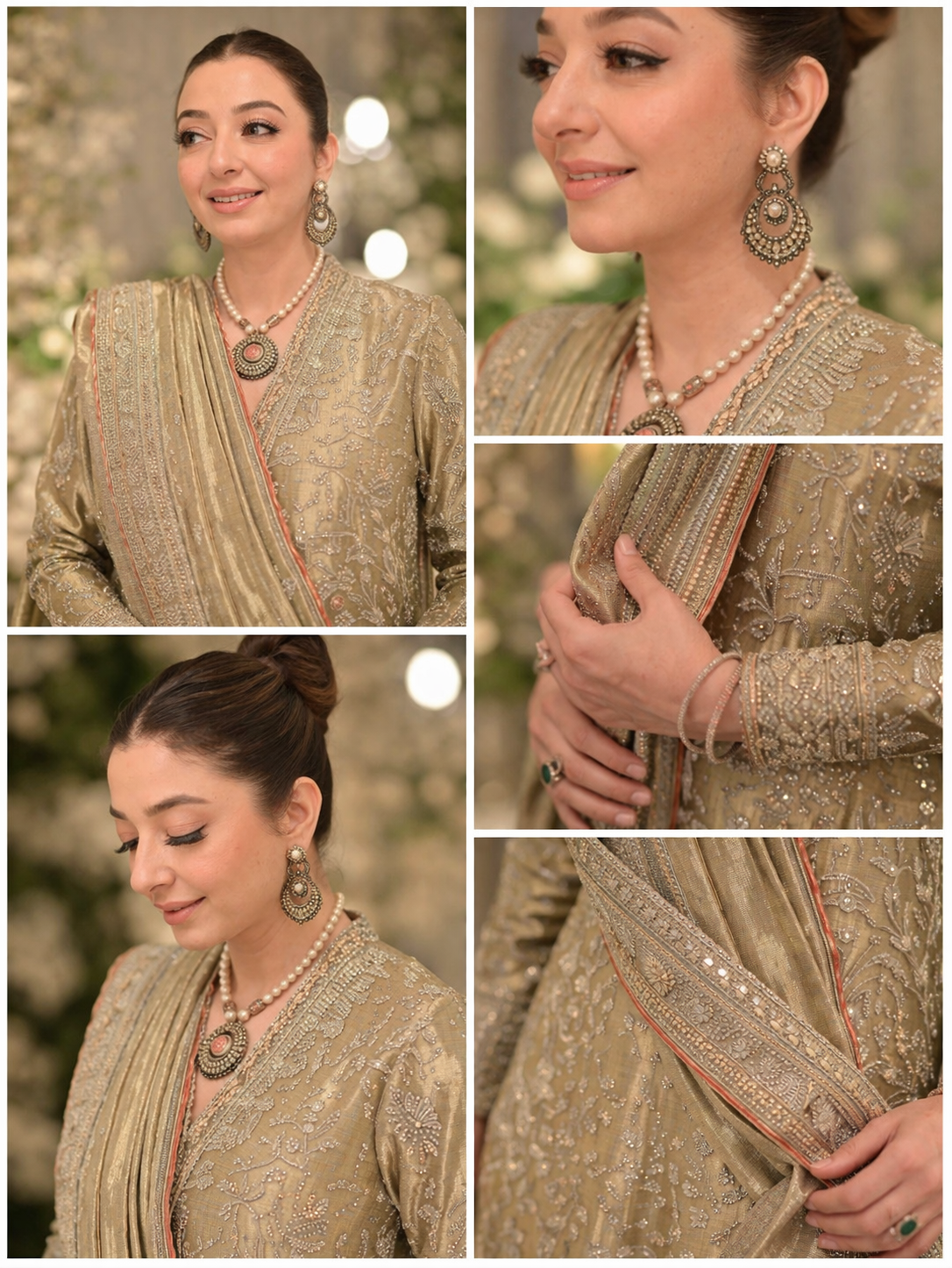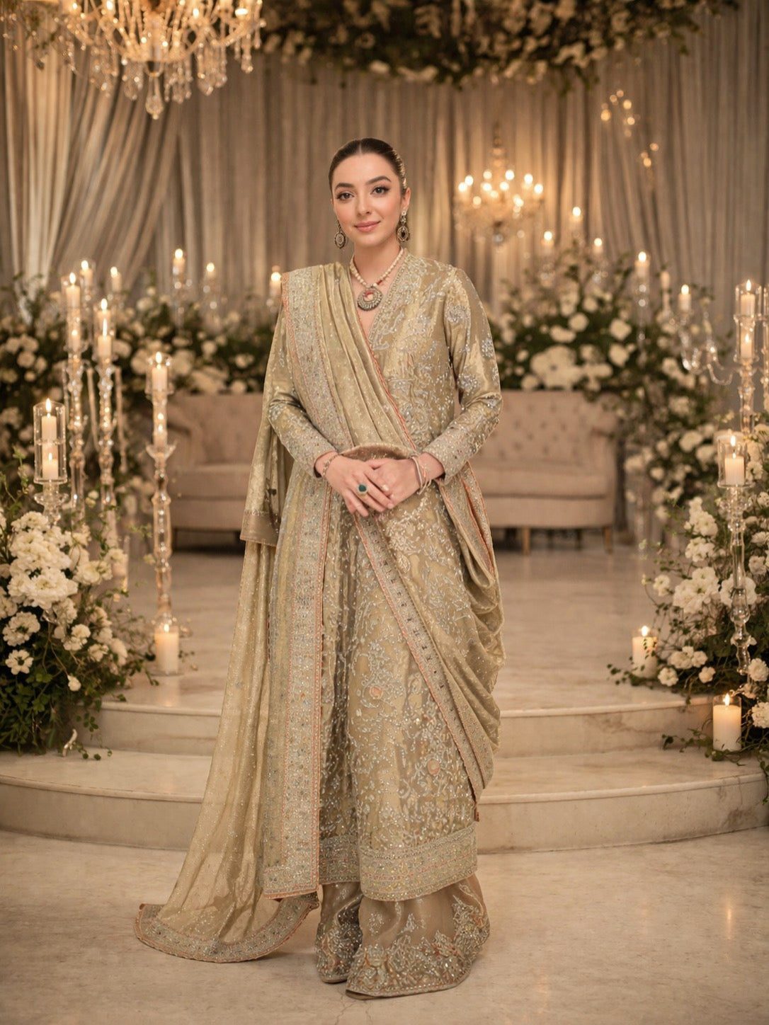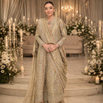 A timeless expression of elegance, this beige and gold ensemble is intricately crafted with rich zardozi, dabka, and hand-embellished detailing, creating a luminous interplay of texture and shine. The Aline silhouette is complemented by a heavily adorned neckline, delicate motifs, and a statement bordered dupatta that adds depth and grandeur with an embroidered dhaka pajama. Perfect for festive occasions and formal gatherings, this piece embodies refined luxury with a graceful, modern allure.