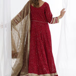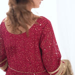 Olive Rose Peshwas is a stunning chiffon Chikankari peshwas with overall embroidery and sequins work, featuring a rich velvet border on the frock, paired with an olive green contrast chiffon embroidered duppata, perfect for making a statement at festive occasions and special events.