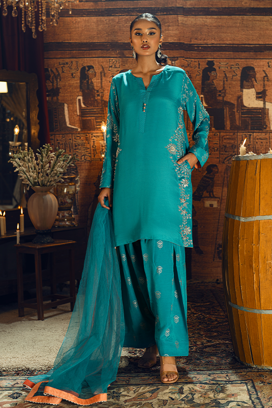 "Resut" is an aqua blue straight short shirt featuring side pockets and alluring screen print in the front sides or sleeves embellished with pearls, dabka, sequins and zardozi work. It is paired with matching screen printed shalwar and matching net dupatta finished with coral and rust color details on border over all.