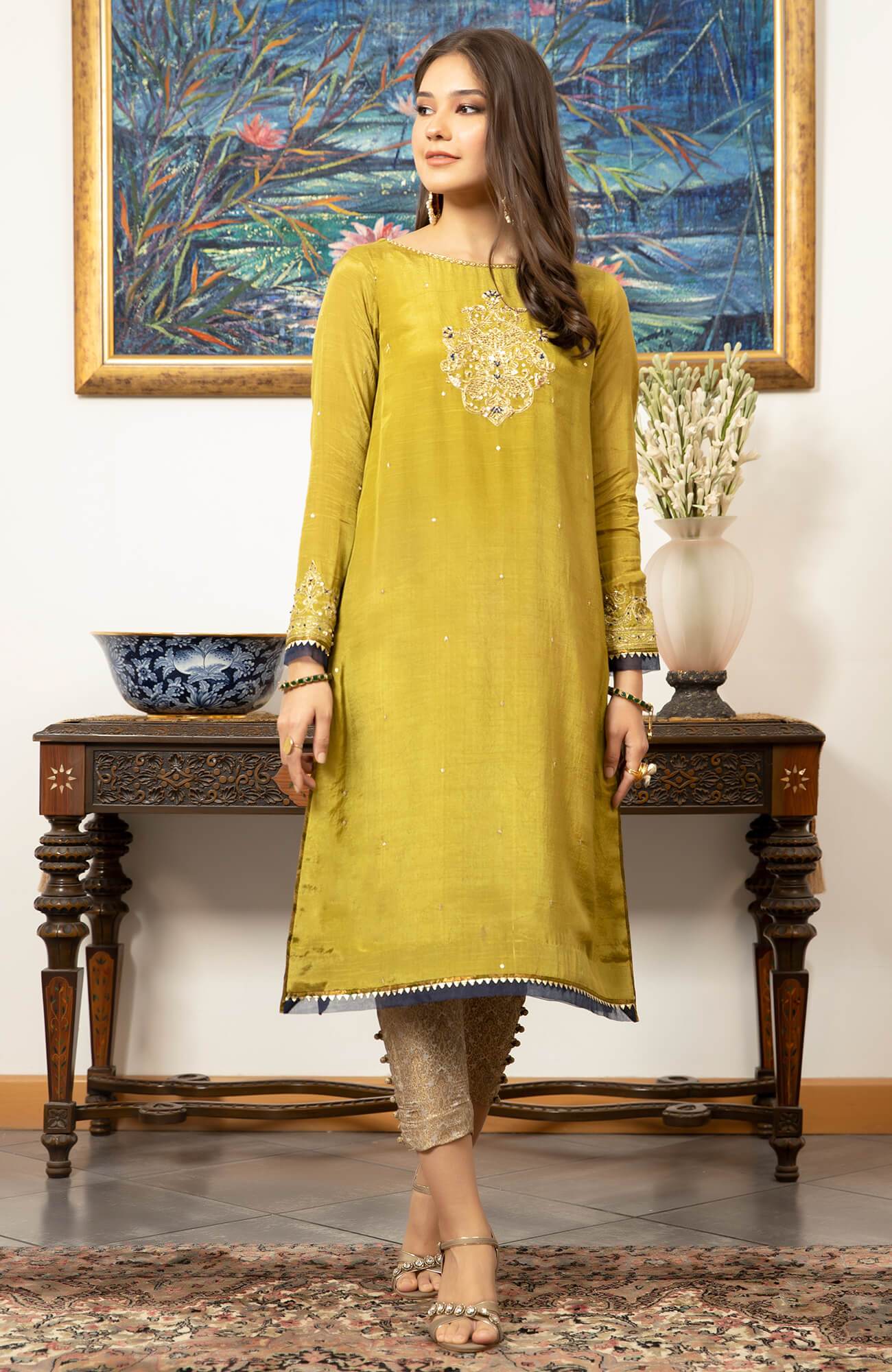 'Subz Roshan' is a vibrant dhaani green straight shirt rendered on pk raw silk fabric. It has handwork of kora, dabka, aari and sitara on neckline motif and sleeves. A dori is added on the back neckline to enhance the look. The overall kurta is finished with a contrasting dark blue finishing's and lace.