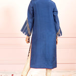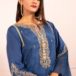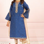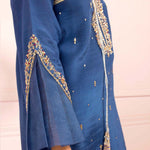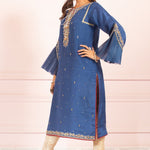 A deep royal blue toned khaddi net shirt, adorned with gold hand embroidery and booti chan all over with a touch of maroon resham with delicate embroidery on the ruffled flared cut sleeves along with maroon paltawa.
