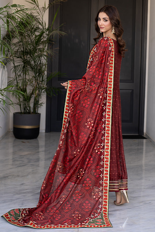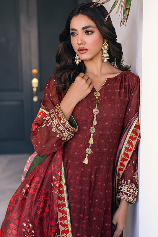 Vanya is a maroon khaadi net kalidaar with hand embroidery on sleeves with dabka, kora, sequins. The front of the neckline adorned with embroidered buttons. Hemline is finished with gota and lace trimmings and green finishing fabric. It is paired with matching raw silk striaght pants and alluring digital printed dupatta with lace detailing.
